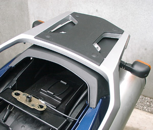 キャリヤマットを外した後はこんな感じです。矢印の位置の穴にブラケットをスクリューで取り付けます。リヤフェンダーとキャリヤの隙間が少ないのでキャリヤを外して取り付けたほうがよさそうです。 実際そうしました。