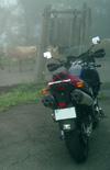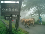 下仁田上野線で254号にでたら内山峠方向へ下仁田トンネルを抜けるころにはすっかり回りは霧で視界は最悪状態、神津牧場の看板を見落とさないように注意して内山トンネルの手前を右折。ここからは林道でかなり道は狭く霧の中を不安になりながら入っていくと突然牛が現れ牧場であることを認識しました。牛を見かけてから少し走ると神津牧場の看板が見え駐車場にバイクを停め牧場へ行ってみる。相変わらずの霧で視界が悪く本来だと草原の中に牛が草を食む姿が見えるのだろうが今日はまったく白い霧だらけ