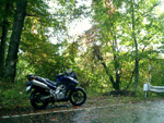 雨と強い風のせいで林道は、落ち葉と枯れ枝が濡れた路面に非常に多く一応全面舗装なのですが、とてもそうは見えず大変滑りやすくなっており慎重に走行しました。