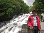 | 戦場ヶ原のレストランで昼食を食べ休憩、ここでもおサルのぬいぐるみがキーキー鳴いていました。戦場が原を後にして、湯滝に寄って見ました。湯ノ湖の南端にある高さ70メートルの滝で、幅は最大で25メートル。滝壷に下りられ、その近くに観瀑台があって、迫力ある姿を眺められます。川沿いにハイキングコースがありとても雰囲気がよく木漏れ日の中、木製の遊歩道を歩くととても気持ちが癒されます。 |