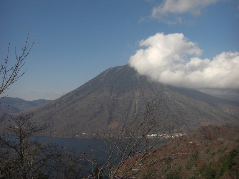 中禅寺湖畔は紅葉も終わりで観光客も少な目です。中禅寺湖を半月山から見ようと立木観音入り口を右に曲がります。行き止まりが半月山駐車場です。ここからは中禅寺湖は望むことが出来ず半月山展望台まで歩いて登ることにしました。普段の運動不足の為、息切れしながら展望台に約30分近くもかかってしまいました。ここからの景色は、中禅寺湖を眼下に望み正面に男体山の雄姿を見ることができます。あと一週間早ければ紅葉がとても綺麗だったんだろうな